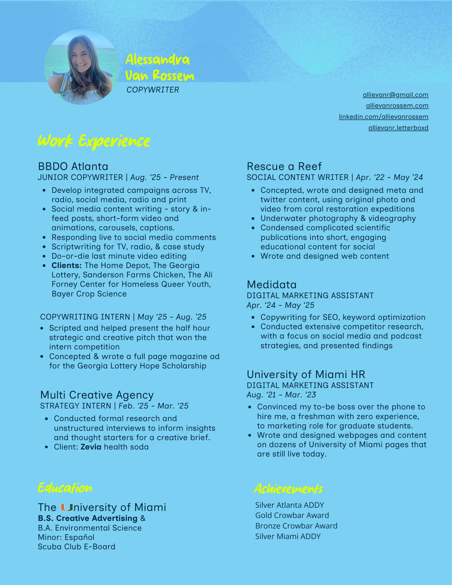 Writing is like that. It’s all trying trying trying bad bad bad, until suddenly you surprise yourself with something THIS IS IT, THIS THIS THIS. Currently, I do lines and get my little rush with the wonderful people at BBDO Atlanta. You can reach me at allievanr@gmail.com, and I hope it’s with a weird food story.